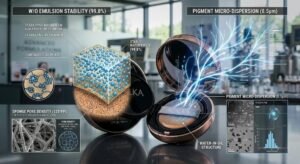 To objectively comprehend the performance superiority of a premium cushion compact, cosmetic chemists must deeply analyze the physics of pigment milling and the thermodynamics of Water-in-Oil (W/O) emulsions. An air cushion requires an exceptionally low-viscosity liquid foundation to properly saturate the internal sponge. However, reducing viscosity typically compromises coverage. To achieve high coverage within a thin fluid, a color cosmetics OEM must utilize advanced triple-roller mills and high-shear homogenizers.